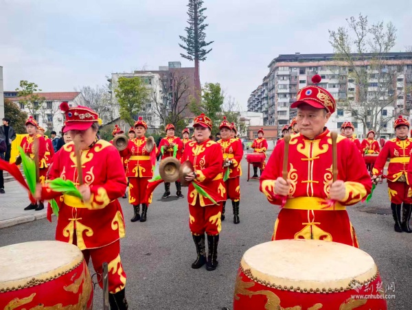 西廠口社區(qū)威風(fēng)鑼鼓隊為漢馬加油。 通訊員供圖