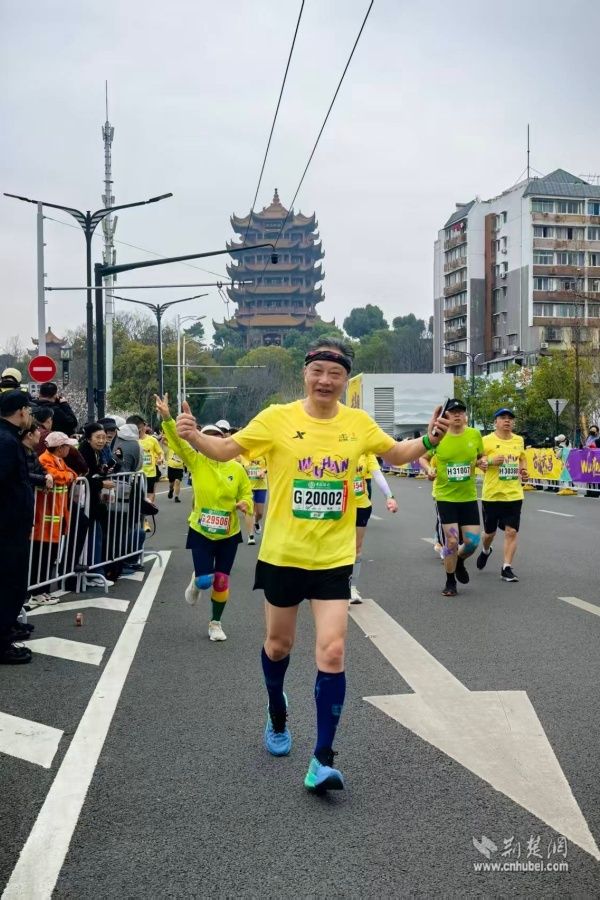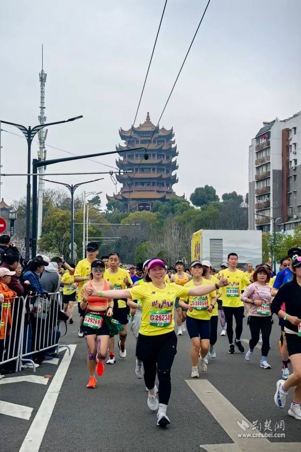 隨著發(fā)令槍響,跑者們?nèi)绯彼阌縼?。?dāng)?shù)谝惶蓐牻?jīng)過黃鶴樓腳下時,賽道兩側(cè)瞬間沸騰。吶喊聲、加油聲此起彼伏,街道工作人員和居民志愿者們揮舞著手臂,用最飽滿的熱情為每一位跑者鼓勁助威。