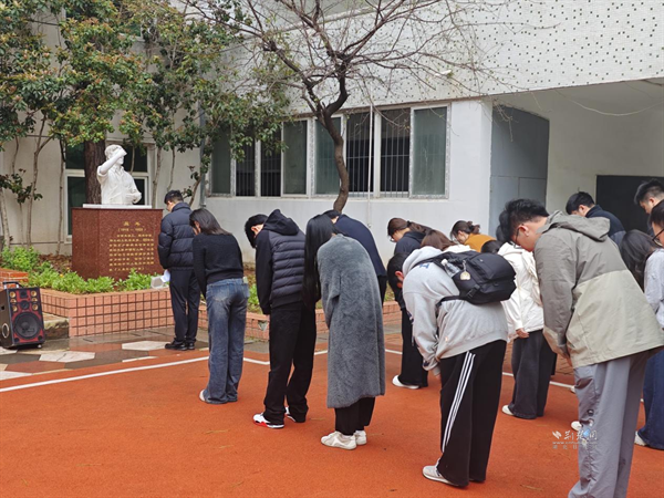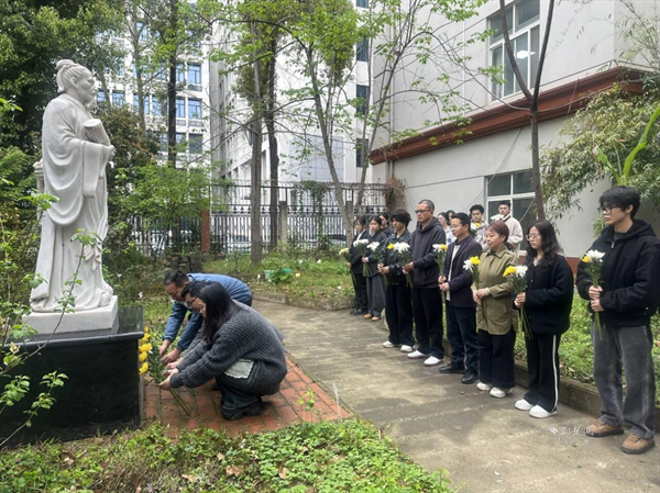 4月3日上午,在求索書院屈原塑像前,在“荊楚風(fēng)流”與“玉蘭學(xué)府”群體塑像旁,文學(xué)院師生代表為屈原、李白、蘇東坡、魯迅等文學(xué)巨匠的塑像細(xì)細(xì)拂拭塵埃,敬獻(xiàn)素菊。師生們低首默哀,仿佛穿越時空,與先賢展開一場跨越千年的對話。