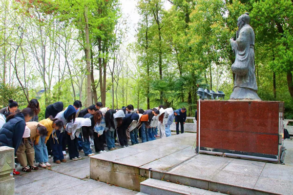 文學(xué)院師生代表在楚風(fēng)園的荊楚風(fēng)流—-歷史名人漢白玉雕像區(qū)向炎帝、楚先王、楚莊王、老子、屈原、王昭君、諸葛亮、孟浩然、陸羽、畢昇、李時珍、張居正、張之洞等先賢拜祭并獻(xiàn)花。 通訊員周晚霞 攝