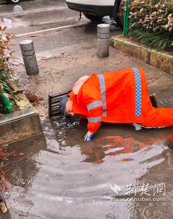 在街道的主次干道上,一群“橙色身影”同樣在風雨中逆行。晨曦路、康泰路沿線,雨水裹挾著落葉、淤泥和塑料袋涌入雨水井,排水口頻頻告急。湘口街環(huán)衛(wèi)中心20名作業(yè)人員頂風冒雨,對40余處井蓋展開緊急清淤。黨齡32年的彭新山俯身徒手掏挖的身影格外引人注目。他半跪在積水中,手持鐵鉤撬開井蓋,直接探進胳膊一把把掏出堵塞的枯枝爛葉,泥漿濺滿臉身也渾然不顧?!斑@個口子堵得厲害,不掏干凈路面積水下不去,老百姓走路、開車都危險?!?/span>