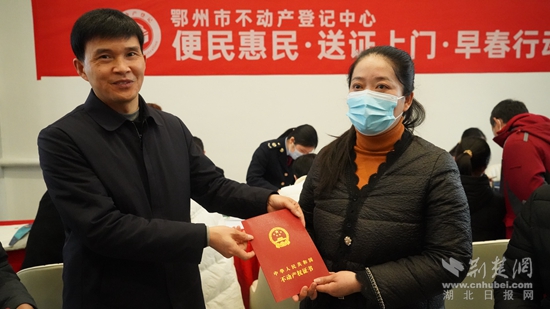 荊楚網(wǎng)(湖北日報(bào)網(wǎng))訊(通訊員 周婷)3月22日上午,鄂州市不動(dòng)產(chǎn)登記中心開展“便民惠民送證上門”活動(dòng),將辦證服務(wù)窗口延伸到楚天都市鑫園售樓部,現(xiàn)場接受購房群眾申請,現(xiàn)場受理,現(xiàn)場發(fā)證。