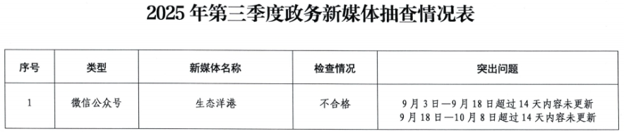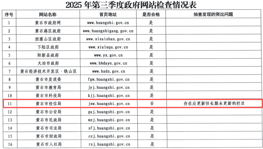 荊楚網(wǎng)(湖北日報(bào)網(wǎng))訊(記者 呂鑒蕾)記者24日獲悉,日前,黃石市政務(wù)服務(wù)管理局組織開展了2025年第三季度全市政府網(wǎng)站與政務(wù)新媒體檢查。其中,黃石市經(jīng)信局官網(wǎng)和“生態(tài)洋港”公眾號因日常維護(hù)管理不到位被點(diǎn)名。