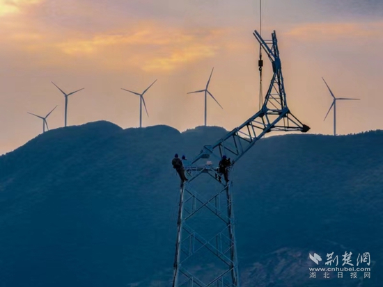 當天下午6點,夕陽染紅了天際。在斜輝映照下,4名電力工人挺立在鐵塔上,準備最后的螺栓緊固工作。