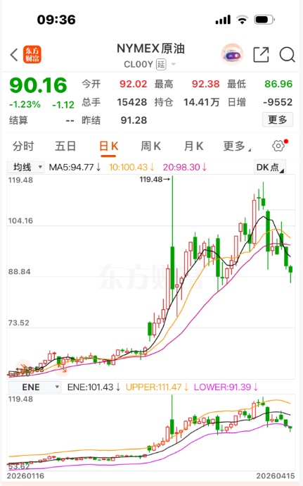 美伊正尋求第二輪和談,據(jù)央視新聞消息,美國(guó)總統(tǒng)特朗普更是在最新采訪中表示,美國(guó)對(duì)伊朗的戰(zhàn)爭(zhēng)已經(jīng)“結(jié)束”。4月14日,國(guó)際油價(jià)應(yīng)聲大幅回落。紐約原油期貨收盤(pán)跌7.08%,報(bào)92.07美元/桶;布倫特原油期貨收盤(pán)跌4.05%,報(bào)95.34美元/桶。4月15日開(kāi)盤(pán)后,紐約原油期貨更是一度跌破90美元/桶大關(guān),最低跌至86.96美元/桶。而就在一周前,紐約、布倫特原油期貨一度雙雙站上110美元/桶大關(guān)。