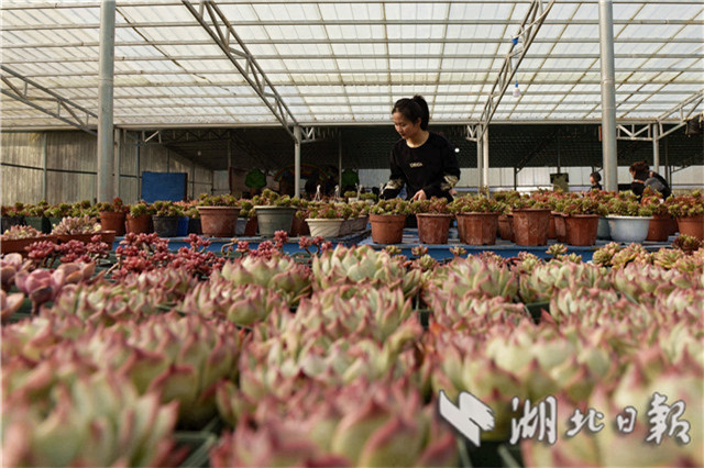 據(jù)了解,該大棚是當(dāng)?shù)乩杳?、杜靜、黎姣等5名創(chuàng)業(yè)女青年返鄉(xiāng)創(chuàng)辦的。2016年初,她們共同投資100萬元返鄉(xiāng)創(chuàng)辦青葉多肉植物種植專業(yè)合作社,種植面積30畝,近千個品種,借助“互聯(lián)網(wǎng)+”平臺,把多肉植物產(chǎn)品放到網(wǎng)上銷售,年產(chǎn)銷多肉植物30多萬株。社里還帶動附近10多個村近百名建檔立卡貧困農(nóng)戶發(fā)展花卉種植,成為當(dāng)?shù)剞r(nóng)民脫貧致富新路徑,助力鄉(xiāng)村振興。(視界網(wǎng)劉建平攝)