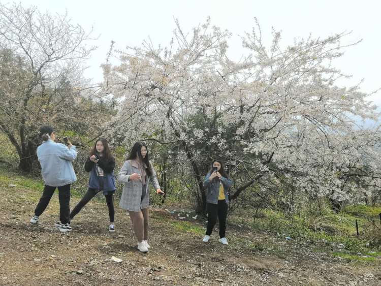 來自湖北大學(xué)藝術(shù)學(xué)院、中南民族大學(xué)美術(shù)學(xué)院、湖北美術(shù)學(xué)院等高校的師生一行登上大幕山山頂,欣賞遍地野櫻花,俯瞰綿綿山谷,大家對這里的風(fēng)景贊不絕口,紛紛拍照留念。