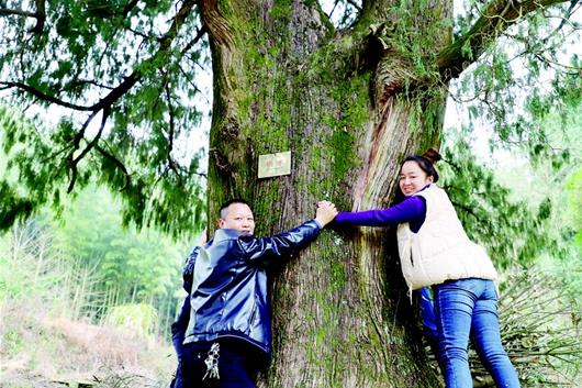 越往山里走,森林越茂密,古樹也越來多。在該村三組的一座老宅后,記者看到一片古樹群。最先映入眼簾的是一棵國家一級柏樹,上面布滿黑褐色紋理,樹干得幾人合圍。不遠(yuǎn)處,還有國家二級杉榔、二級柏樹等,整個山坡,就被大大小小幾十棵大樹遮蔽,其中被掛牌保護的就有8棵?!拔覀兇逵?1個自然村灣,每個灣子都有這樣的原始老林,而且很多都已被掛牌保護,這是村里最大的財富?!贝逯淌烂髡f。他還給記者講了個故事,有一年,一家知名公司的人看上這里的樹,他們愿意出價三萬元,買走其中一棵,但村民們毫不心動,當(dāng)場就給拒絕了!
