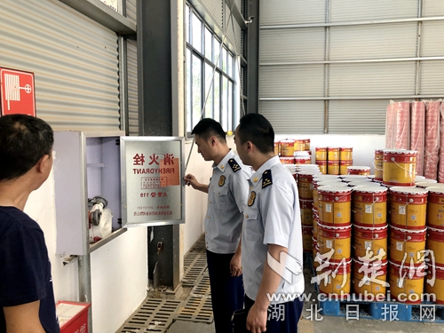 圖為消防執(zhí)法人員檢查倉儲(chǔ)消防設(shè)施現(xiàn)場。 阮子祥攝
