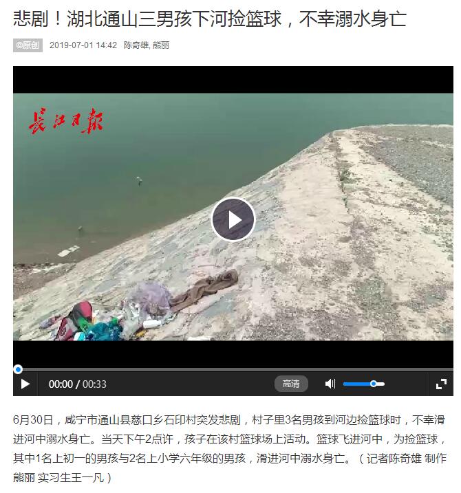 6月30日,咸寧市通山縣慈口鄉(xiāng)石印村突發(fā)悲劇,村子里3名男孩到河邊撿籃球時(shí),不幸滑進(jìn)河中溺水身亡。當(dāng)天下午2點(diǎn)許,孩子在該村籃球場上活動(dòng)。籃球飛進(jìn)河中,為撿籃球,其中1名上初一的男孩與2名上小學(xué)六年級的男孩,滑進(jìn)河中溺水身亡。(記者陳奇雄 制作 熊麗 實(shí)習(xí)生王一凡)