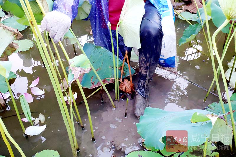 荷田里荷葉密集,既悶又熱,有些地方淤泥齊膝。蓮農們一般身前身后各掛一個編織袋,大約 40分鐘采滿上岸。