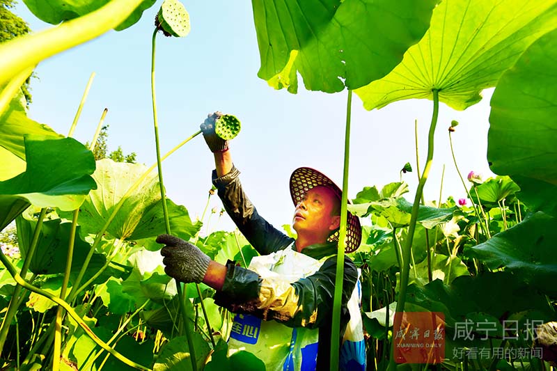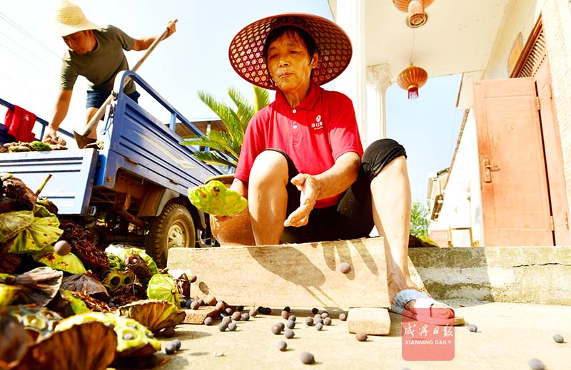 “現(xiàn)在每天5點半就下田,天太熱,一般采到9點多收工,怕中暑?!眲⑺既河靡滦洳亮艘话押顾榻B,夏天是蓮子的高產季,村里大概有60多戶種湘蓮,每天100多人在田里勞作。