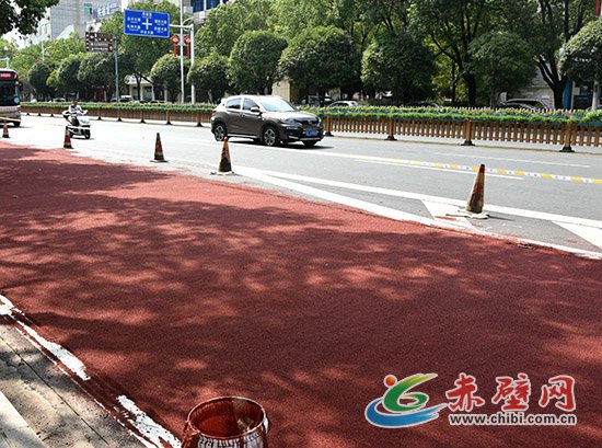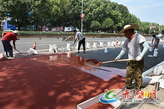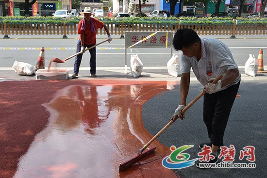 赤壁網(wǎng)消息(記者 聶愛陽(yáng))先往地面倒上攪拌均勻的膠粘劑,用推水器推平;再往上撒上陶瓷顆粒,用鐵鏟抹勻。頃刻間,一條嶄新的紅色防滑車道就這樣鋪就而成。8月6日,在赤壁市沿河大道,工人們正在緊張鋪設(shè)紅色防滑車道。