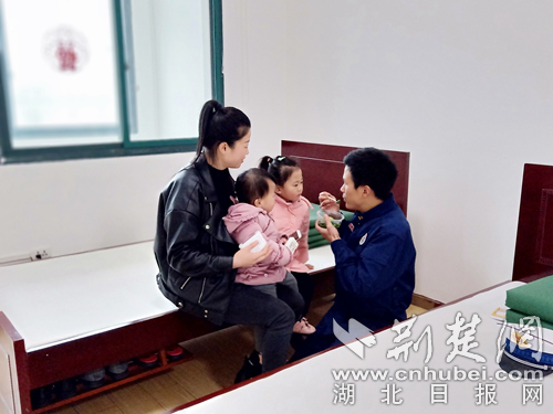 溫泉大隊(duì)參謀 喻劍溫泉大隊(duì)參謀喻劍——春節(jié)期間堅(jiān)持駐守在自己的崗位上,未能回到家中和親人團(tuán)聚。2月8日,年幼的女兒想念父親,在和他的視頻中哭泣,詢問爸爸為什么還不回家,喻參謀不忍心欺騙孩子,只能暗暗傷心。到了當(dāng)晚,妻子攜女兒來到三號橋執(zhí)勤站探望駐守在崗的他,給他帶來了一個(gè)驚喜,相機(jī)記錄下這幅溫馨和諧、父慈子孝的親情畫卷。