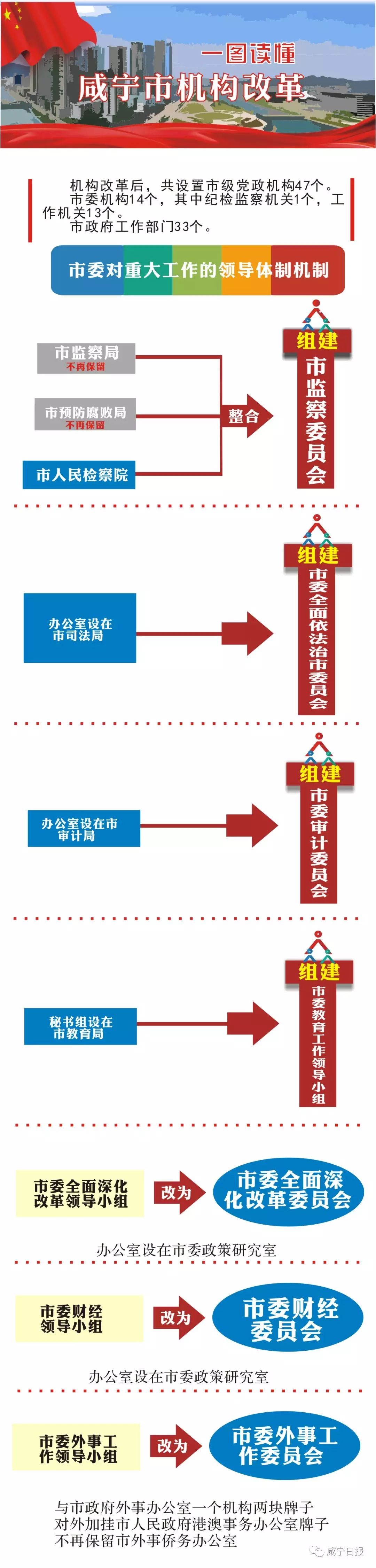 我市召開機構(gòu)改革動員大會,標志著我市機構(gòu)改革全面啟動。根據(jù)省委省政府批準的《咸寧市機構(gòu)改革方案》,本輪機構(gòu)改革后,市本級共設(shè)置黨政機構(gòu)47個。市委機構(gòu)14個,市政府工作部門33個。改革方案還對黨政直屬事業(yè)單位實施了限額管理,并進一步規(guī)范了黨政派出機構(gòu)置。