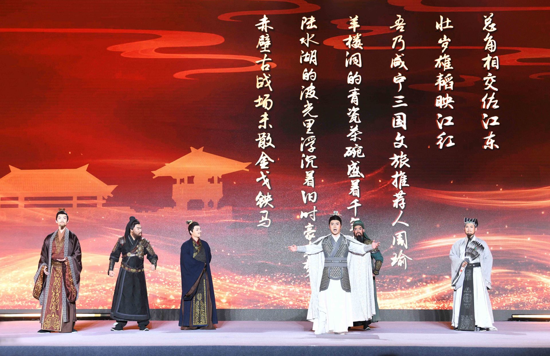 “三國六城,今日結(jié)盟!與君共同開啟,荊楚三國文化之旅?!眴邮缴?,身著古裝的文旅推薦官,化身三國英雄劉備、關(guān)羽、張飛、諸葛亮、孫權(quán)、周瑜等,穿越歷史時空,分別代表武漢、荊州、宜昌、襄陽、鄂州、咸寧對外推介各地三國旅游景點和線路。