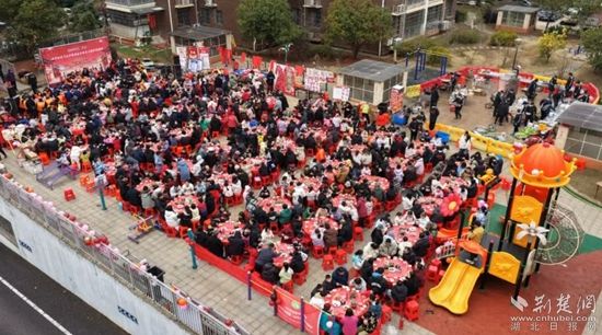 2月7日,臘月二十,咸安區(qū)浮山街道香城社區(qū)書苑小區(qū)廣場上,60張圓桌依次排開,700多位居民攜家?guī)Э诟斑@場鄰里之約,啤酒燒鴨的濃香、合菜面的爽口在空氣中交織,舞獅鑼鼓與歡聲笑語相映成趣。這場“我們的節(jié)日·春節(jié)”社區(qū)百家宴,正是咸寧社區(qū)文化節(jié)的生動縮影。