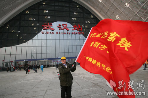一位武漢站的建設者在站前廣場揮動旗幟,今天他們將坐上首列開往廣州的高鐵。