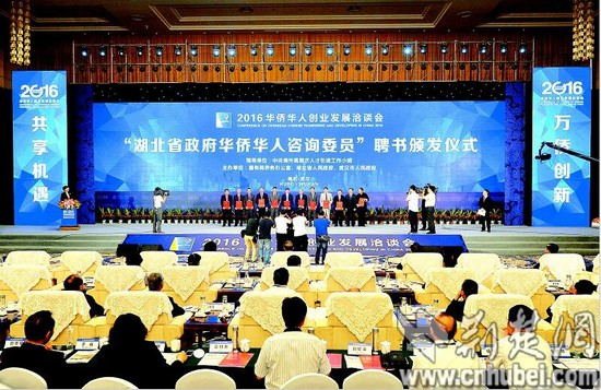圖為:昨日上午,2016年“華創(chuàng)會(huì)”在武漢東湖國(guó)際會(huì)議中心開(kāi)幕。圖為“湖北省政府華僑華人咨詢(xún)委員”聘書(shū)頒發(fā)儀式現(xiàn)場(chǎng)。...">